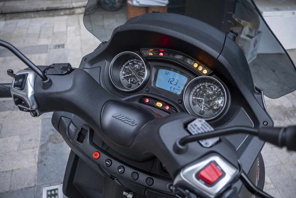 Bên cạnh đó, Piaggio Beverly S 400 HPE cũng được trang bị thêm nhiều tính năng hiện đại giúp tăng độ an toàn cũng như sự tiện dụng cho người lái. Hệ thống chống bó cứng phanh ABS và kiểm soát chống trượt ASR, cộng thêm cảm biến nghiêng là bộ ba hoàn hảo giúp đảm bảo an toàn tối đa khi vận hành xe. Tính kết nối cũng được Piaggio chú trọng nâng cấp trên mẫu xe này. Không còn sử dụng khóa cơ Immobilizer, Piaggio Beverly S 400 HPE ứng dụng công nghệ keyless thông minh, giúp chủ nhân có thể dễ dàng mở/khóa xe, tìm kiếm xe từ xa hay mở cốp tự động. Màn hình LCD 5.5” cùng hệ thống MIA đặc trưng của Piaggio kết nối chiếc xe với điện thoại thông minh của người lái, cho phép người lái nhận thông báo, quản lý cuộc gọi hay danh sách phát khi đang lái xe một cách dễ dàng.