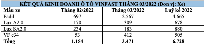 Luỹ kết hết quý I/2022, VinFast đã bán ra tổng cộng 6.728 xe, bao gồm 4.665 xe Fadil, 678 xe Lux A2.0, 880 xe Lux SA2.0 và 505 xe VF e34: