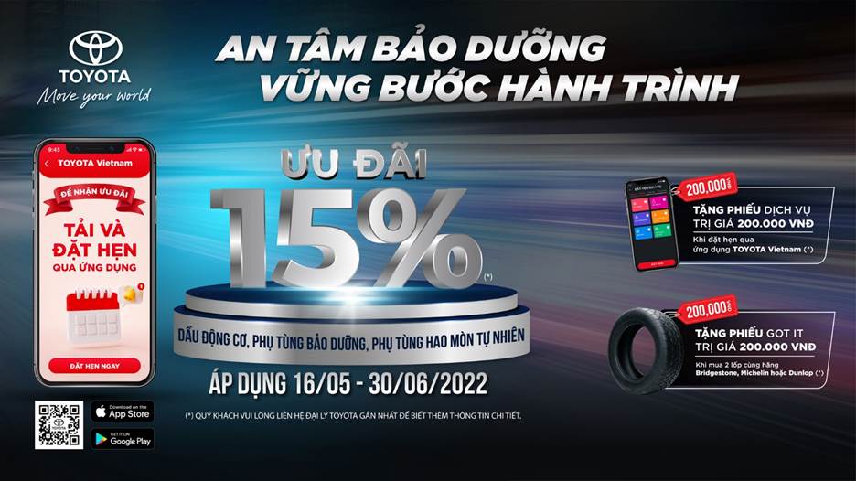 Nhằm tri ân khách hàng đã tin tưởng lựa chọn sản phẩm mang thương hiệu Toyota, từ 16/05 đến 30/06/2022, Công ty Ô tô Toyota Việt Nam và hệ thống đại lý trên toàn quốc thực hiện chương trình ưu đãi dịch vụ “An tâm bảo dưỡng – Vững bước hành trình”.