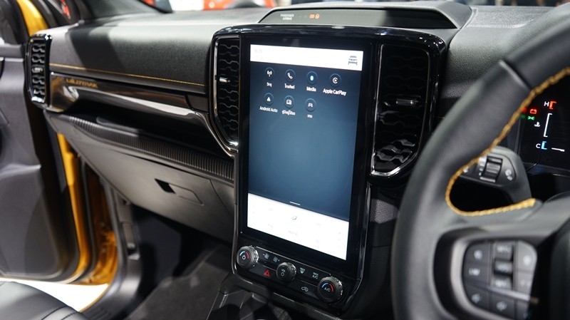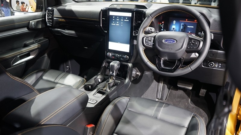 Nội thất Ford Ranger 2023 được đánh giá là hiện đại bậc nhất phân khúc. Các trang bị có lẽ sẽ giống với phiên bản ra mắt thị trường Thái Lan với cụm đồng hồ Full-LCD 12,4 inch, màn hình giải trí trung tâm đặt dọc tùy chọn kích thước 10,1 inch hoặc 12 inch, hệ thống thông tin giải trí SYNC 4. Khi kích hoạt chế độ lái off-road, màn hình trung tâm sẽ chuyển sang hiển thị các thông số liên quan.