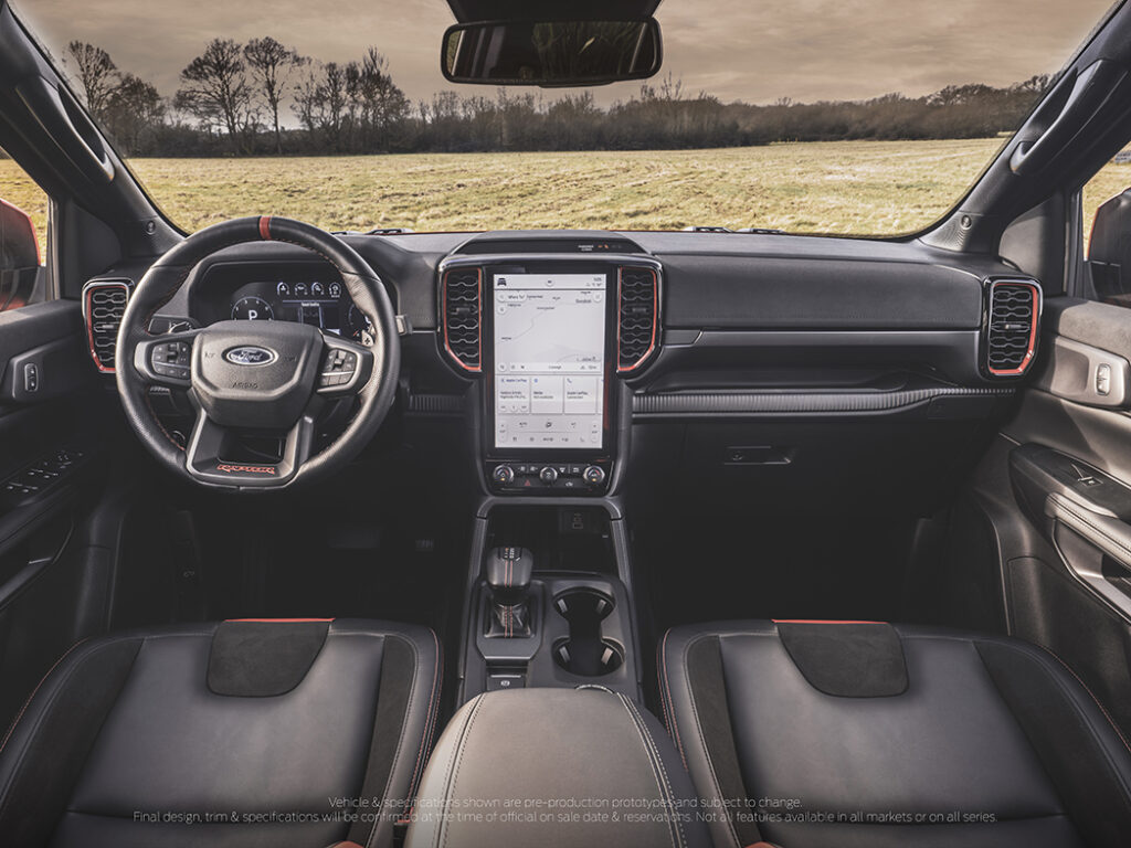 Bảng điều khiển với các điểm nhấn tông màu cam (Code Orange) trên bảng điều khiển, trong khi đó các đường viền và ghế ngồi được làm nổi bật bởi hệ thống đèn trang trí nội thất của Raptor, giúp tổng thể khoang nội thất có được tông màu hổ phách sang trọng. Vô-lăng thể thao bọc da cao cấp với điểm đặt ngón tay cái được làm phồng ôm theo hình dáng bàn tay. Vô lăng cũng có điểm đánh dấu vị trí 12 giờ và lẫy chuyển số thể thao sau vô lăng bằng ma-giê đúc giúp hoàn thiện thiết kế ấn tượng.