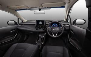 Bên trong, nội thất của Toyota Corolla Altis 2022 sẽ được bọc da trên cả 3 phiên bản, đi kèm ghế chỉnh điện 10 hướng. Một số trang bị đáng chú ý sẽ xuất hiện trên 2 bản 1.8V và 1.8HV gồm có màn hình đa thông tin 7 inch sau vô lăng (bản 1.8G vẫn chỉ sử dụng bảng Optitron gồm đồng hồ analog kết hợp màn TFT 4,2 inch), màn hình giải trí 8 inch đặt nối có kết nối Apple CarPlay không dây và ngoài ra còn có điều hòa tự động 2 vùng và phanh tay điện tử.