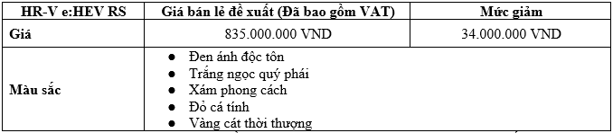 Ngày 26 tháng 02 năm 2026, Honda Việt Nam (HVN) chính thức áp dụng giá bán lẻ đề xuất mới cho mẫu xe HR-V phiên bản e:HEV RS tại thị trường Việt Nam.