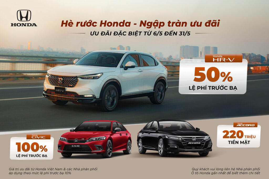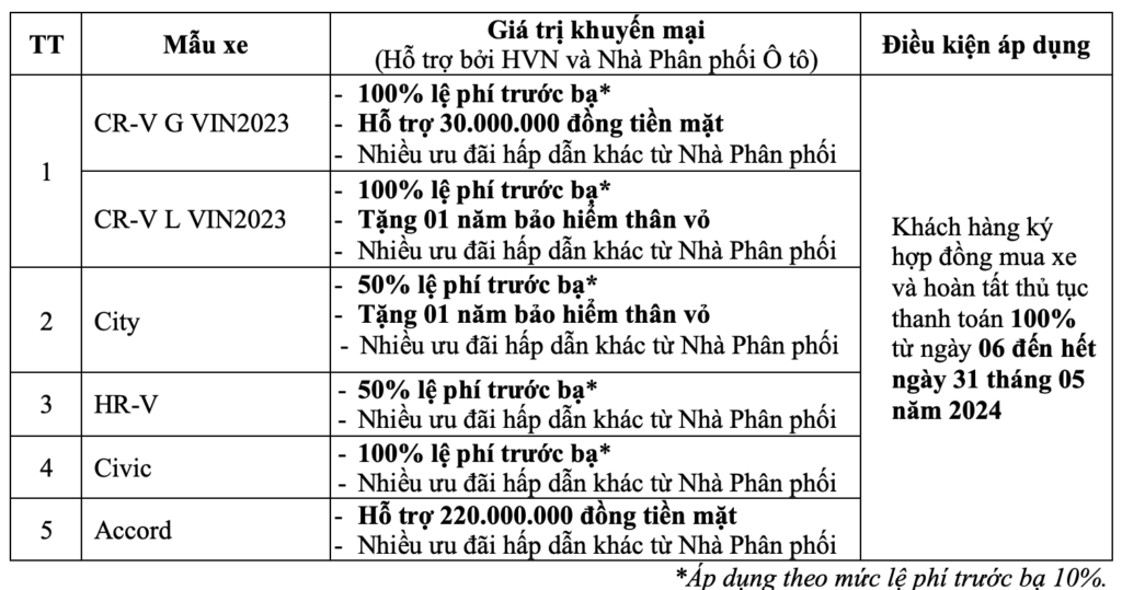Trong tháng 5 (từ 6 đến 31/5/2024) Honda Việt Nam cùng hệ thống Nhà phân phối triển khai chương trình khuyến mại cho các dòng xe Honda City, Honda HR-V, Honda Civic và Honda Accord và Honda CR-V L/G sản xuất năm 2023 (VIN2023).