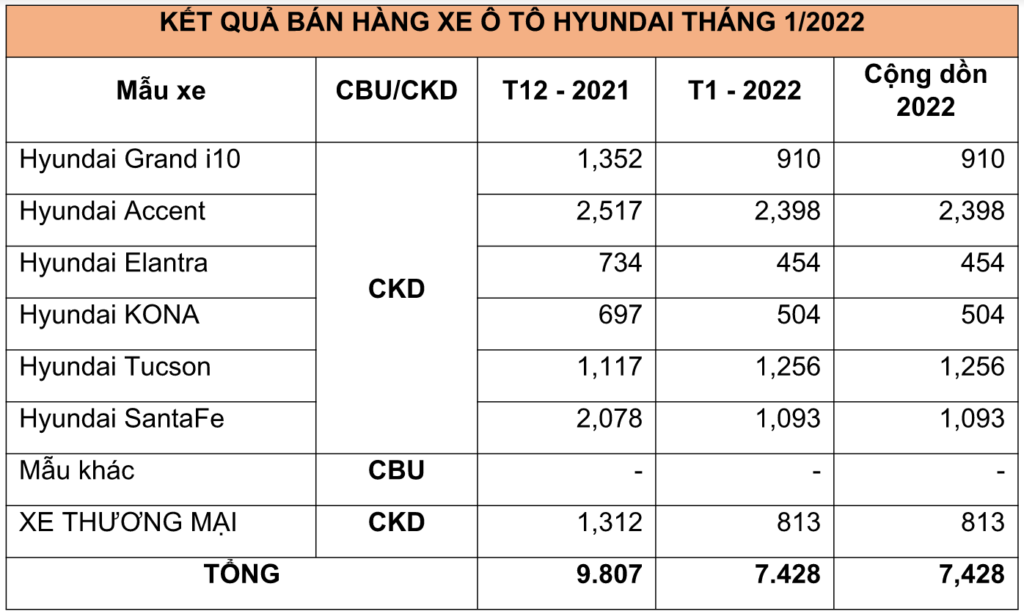 Các mẫu xe khác như Hyundai Grand i10, Elantra, KONA và Santa Fe có sự sụt giảm doanh số so với tháng 12/2021. Thời điểm tháng 1 là tháng Tết dẫn đến nhu cầu mua sắm xe ô tô giảm dần về cuối tháng do khách hàng gặp khó khăn trong việc đăng kí cũng như các kế hoạch mua sắm khác dành cho Tết. Đây là nguyên nhân chính dẫn đến sự sụt giảm doanh số trong tháng 1/2022.