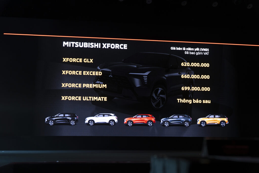 Ngày 10/1, Mitsubishi Motors Việt Nam chính thức ra mắt Xforce hoàn toàn mới, mẫu xe thuộc phân khúc SUV hạng B của Mitsubishi Motors. Tại Việt Nam, Xforce sẽ có 4 phiên bản – GLX, Exceed, Premium và Ultimate cùng mức giá lần lượt là 620, 660 và 699 triệu đồng; còn phiên bản cao nhất vẫn được giữ bí mật.