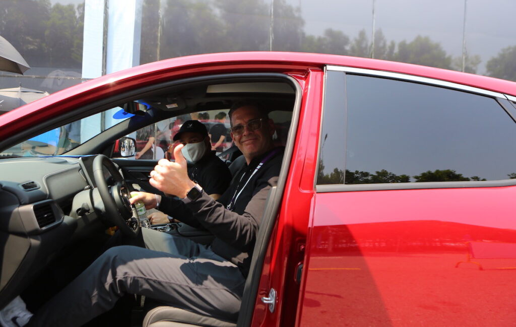 Một vị khách bày tỏ sự phấn khích sau khi lái thử mẫu VF8 trong khuôn viên tổ hợp sản xuất VinFast tại Hải Phòng
