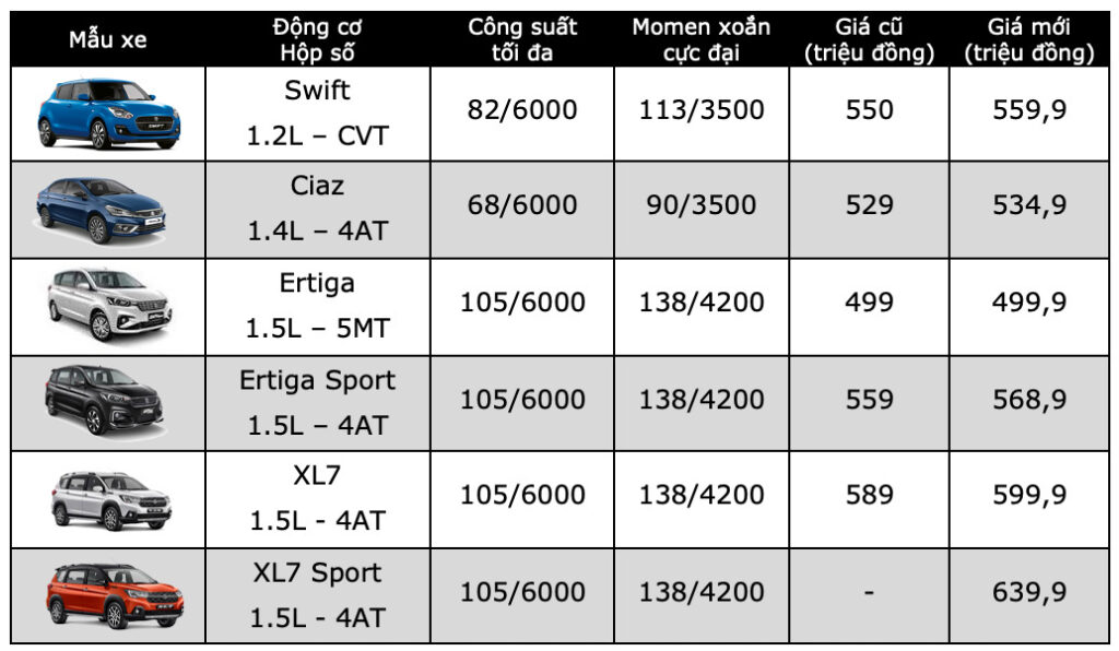 Cũng trong dịp này, Suzuki Việt Nam cho biết đã hoàn thiện việc nâng cấp hệ thống khí xả cho toàn bộ các mẫu xe du lịch mới của mình tại Việt Nam, bao gồm Suzuki Swift, Ertiga, XL7, cùng mức giá bán thay đổi mới cụ thể như sau:
