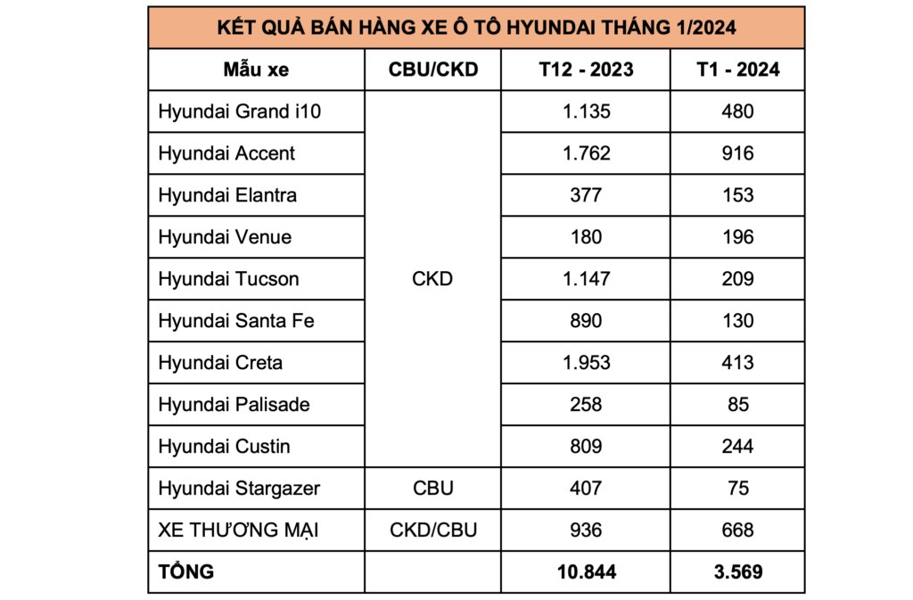 Tháng 1 năm 2024 là thời điểm cận dịp Tết nguyên đán, gây nên tâm lí hạn chế mua sắm với khách hàng, dẫn đến doanh số của Hyundai nói riêng cũng như toàn thị trường nói chung suy giảm. Khi qua thời gian nghỉ Tết, thị trường được ổn định trở lại sẽ mang kì vọng vào mức doanh số tăng trưởng cao hơn trong các tháng kinh doanh tiếp theo.