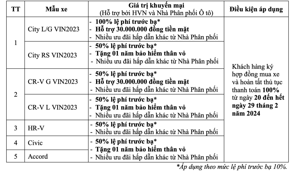 - Hỗ trợ đặc biệt với số lượng giới hạn dành cho các dòng xe sản xuất năm 2023 (VIN2023): Honda City và Honda CR-V L/G.