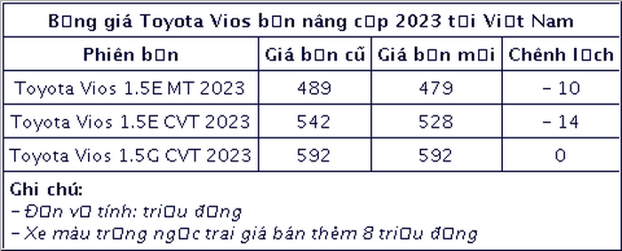 Dù sở hữu nhiều nâng cấp, Toyota Vios 2023 bản cao nhất không tăng giá so với đời cũ, từ 592 triệu đồng. Hai bản thấp hơn là Vios E MT và Vios E CVT có giá lần lượt 479 triệu và 528 triệu đồng. So với đời trước, hai phiên bản này giảm lần lượt 10 triệu và 14 triệu đồng. Cụ thể: