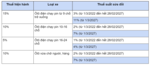 Loại chở người từ 10 đến dưới 16 chỗ, từ ngày 1/3/2022 đến hết ngày 28/2/2027 là 2%; từ ngày 1/3/2027 là 7%.