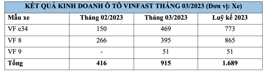 Luỹ kế ba tháng đầu năm 2023, VinFast đã bàn giao tổng cộng 1.689 xe ô tô điện cho khách hàng tại thị trường Việt Nam, bao gồm 773 chiếc VF e34, 865 chiếc VF 8 và 51 chiếc VF 9.