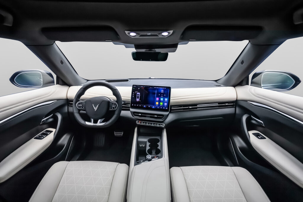 VF 7 được thiết kế hướng tới người lái, với các điểm nhấn ở nội thất là màn hình giải trí cảm ứng cỡ lớn lên tới 12,9 inch, hệ thống hiển thị thông tin trên kính lái HUD, vô lăng D-cut phối hai màu độc đáo cùng dàn phím bấm chuyển số được thiết kế tinh tế như những phím đàn piano.