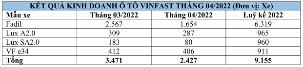 Ngày 10/05/2022, Công ty TNHH Kinh doanh Thương mại và Dịch vụ VinFast công bố kết quả kinh doanh ô tô tháng 04/2022, với tổng số 2.427 xe bán ra.