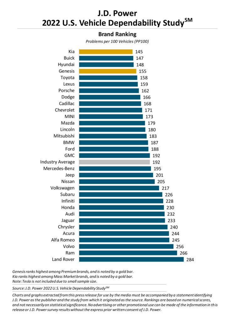 Đứng ở vị trí đầu, thật bất ngờ khi không phải là thương hiệu nào đến từ Nhật Bản luôn nổi tiếng với độ bền bỉ hay những thương hiệu cao cấp đến từ Châu Âu mà là Kia. Mẫu xe của thương hiệu này chỉ gặp 145 vấn đề về chất lượng trên 100 phương tiện. Thấp hơn nhiều con số trung bình 192 PP100 của toàn ngành.
